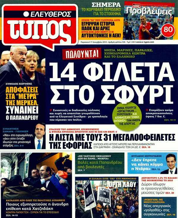 Πρωτοσελιδα πολιτικων και αθλητικων εφημεριδων